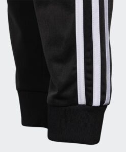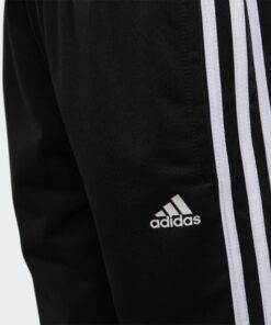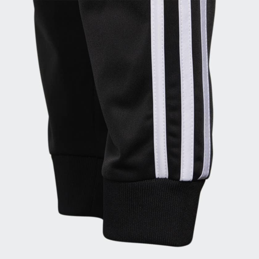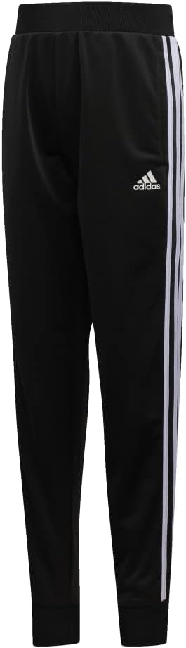 The tricot jogger features detached rib waistband and cuffs, on seam pockets and dazzle applied stripes down side seams. Heat transfer Adidas brand mark on front left hip.