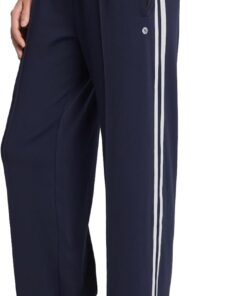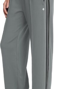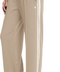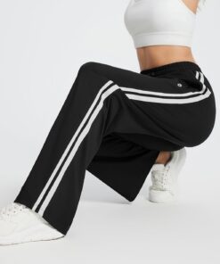 Women’s sweatpants with mid seams and stripes can be flattering the leg shape.