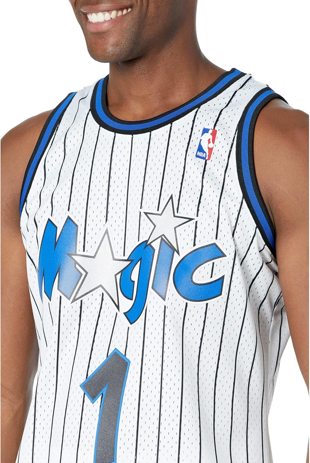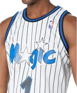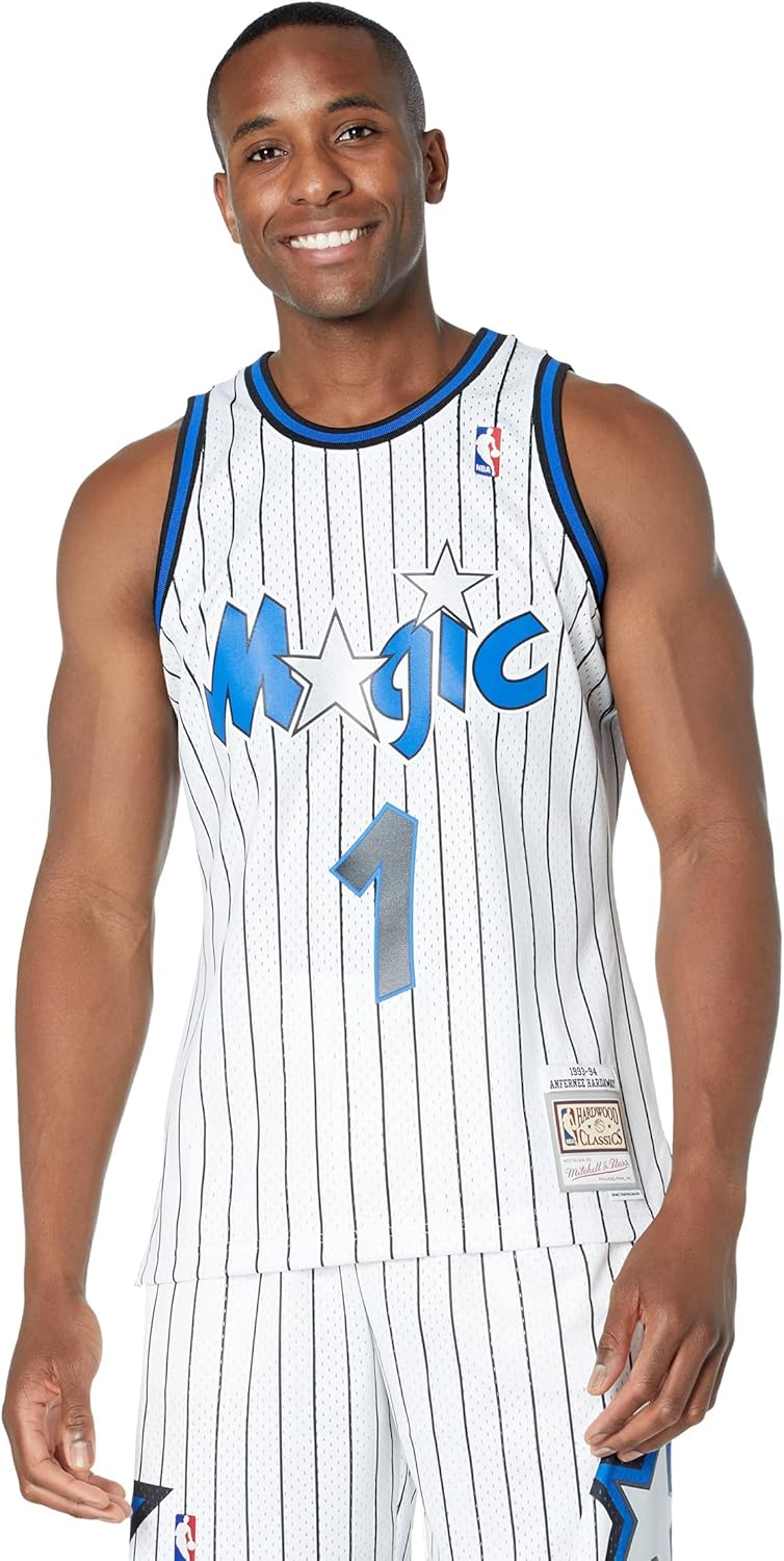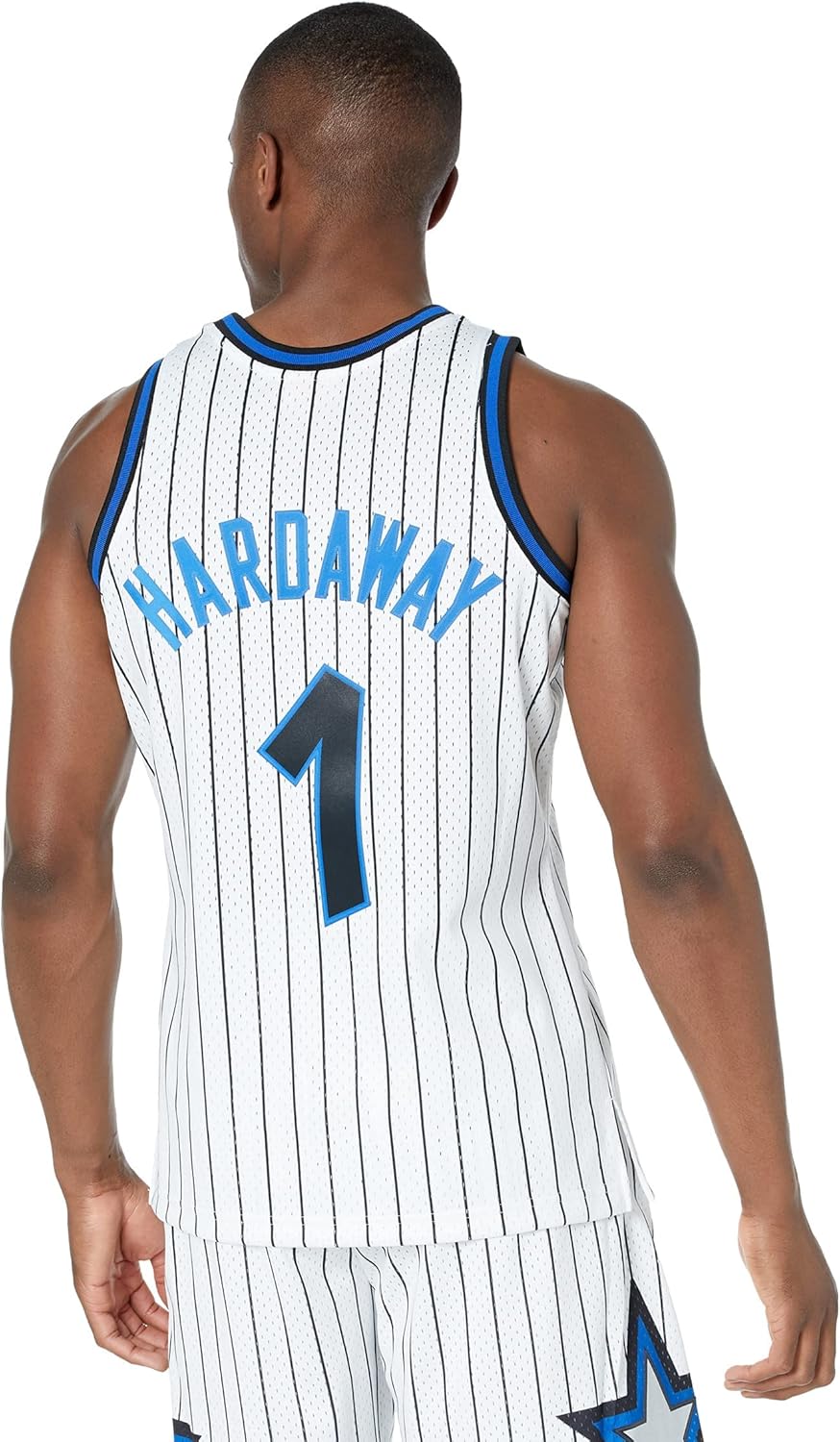 This is an Anfernee Hardaway Orlando Magic 1993-94 men’s white pinstripe Swingman jersey. Made by Mitchell & Ness, this jersey has heat-sealed graphics, player name, and numbers. Fits true to size. Officially licensed.