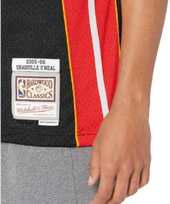 Mitchell & Ness presents the Miami Heat Shaquille O’Neal #32 ’05-’06 Road Jersey, perfect for both on and off-court wear. Crafted with a lightweight mesh, it offers a classic fit and stylish appearance. Don’t miss out, grab yours now before they’re gone!- Ribbed v-neck collar- Officially licensed- Regular fit- Hardwood Classics jock tag- NBA tag at front- Mesh body- All-over print- Contrasting details- Front and back screen-printed tackle Twill applique- Material: 100% Polyester- Color: Black- Style: MNSQ18017