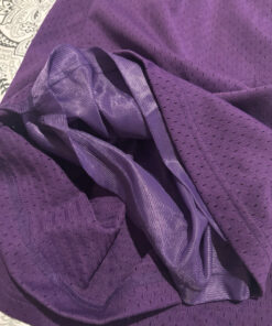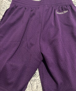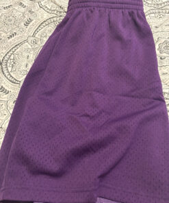 The product is a pair of Mitchell & Ness purple mesh athletic basketball shorts for men in size XL. These solid shorts feature a drawstring closure and an elastic waist with a compression area. Designed for activewear, they are machine washable and perfect for sports like basketball, with a fit tailored for athletic performance. The purple color and 8-inch inseam make them suitable for summer, fall, and spring seasons, adding a pop of color to any athletic ensemble.