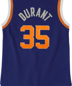 Introducing the Kevin Durant Phoenix Suns NBA Baby Infants 12-24 Months Purple Icon Edition Romper Onesie Player Jersey! This adorable onesie is perfect for your little basketball fan. Crafted with high-quality materials, it features the iconic Phoenix Suns colors and design, with Kevin Durant’s name and number prominently displayed. The soft and stretchy fabric ensures a comfortable fit for your growing baby, while the snap closures make diaper changes a breeze. Whether you’re cheering on the Suns at home or out and about, this romper onesie is sure to be a hit. Show your team spirit and keep your little one cozy in this officially licensed NBA apparel. Please refer to the size chart for accurate fitting. Hand wash or machine wash on a gentle cycle for best results.